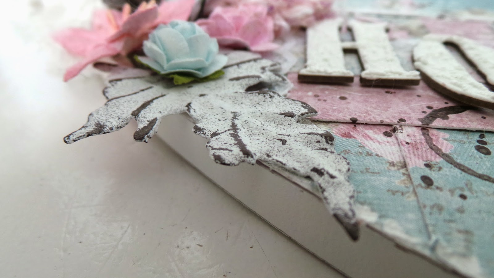 Some modeling paste using a template from the Crafter Workshop and paint splatters.