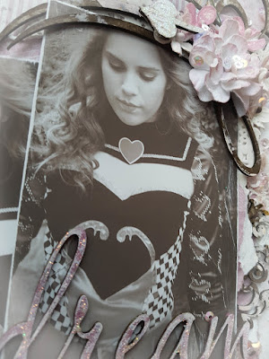 I have also used a Swirly Frame chipboard. It was cut into two and used to frame these beautiful photo’s of my daughter Ashlea. We held a Mad Hatters Tea Party a little while back and she dressed as the Queen and looked just stunning. These photos of course were changed to a Sepia tone to help fit my layout and the moodboard.