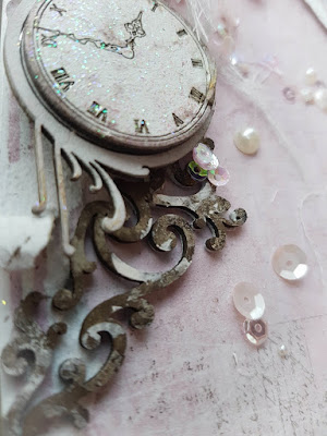 Here you can see my Fleur de Lis coloured with inks and paints. Atop of it I sat the small Decorative #1 frame and then on top of that a Mini Clock Face. The mini clockfaces are the perfect fit for this frame!!