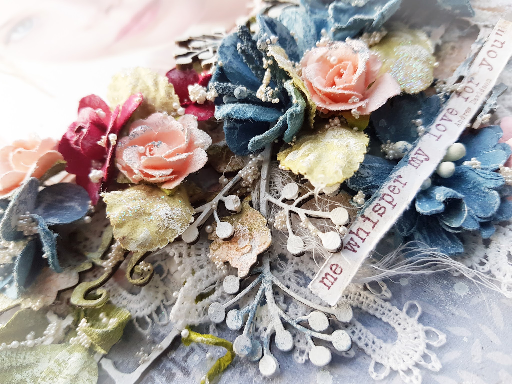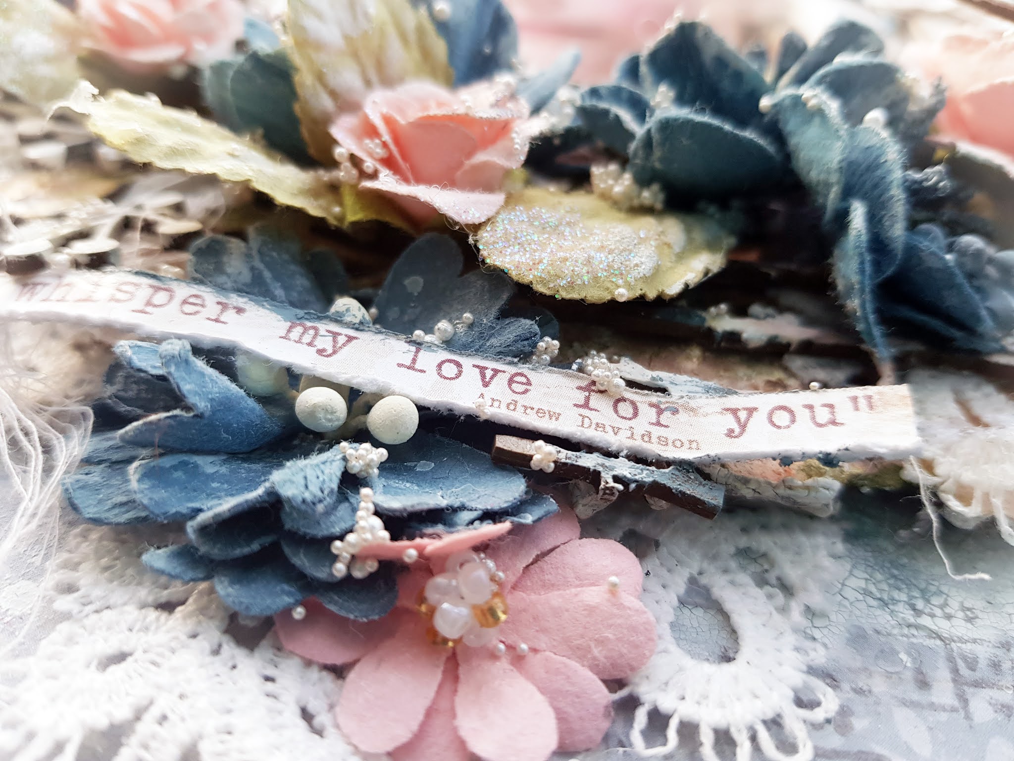 Lots of lace and leaves with pretty flower pearls and muslin were also added in amongst these layers.