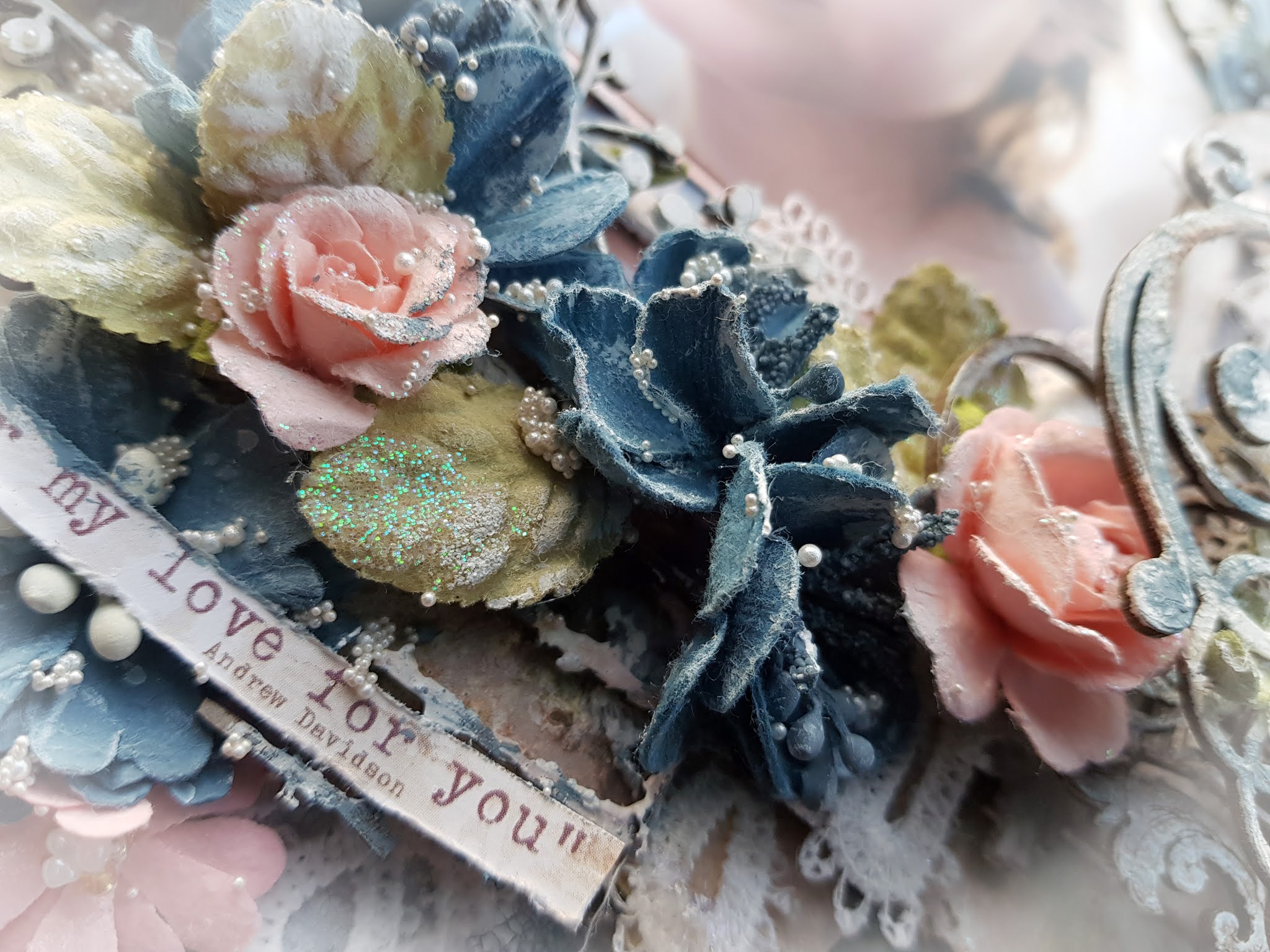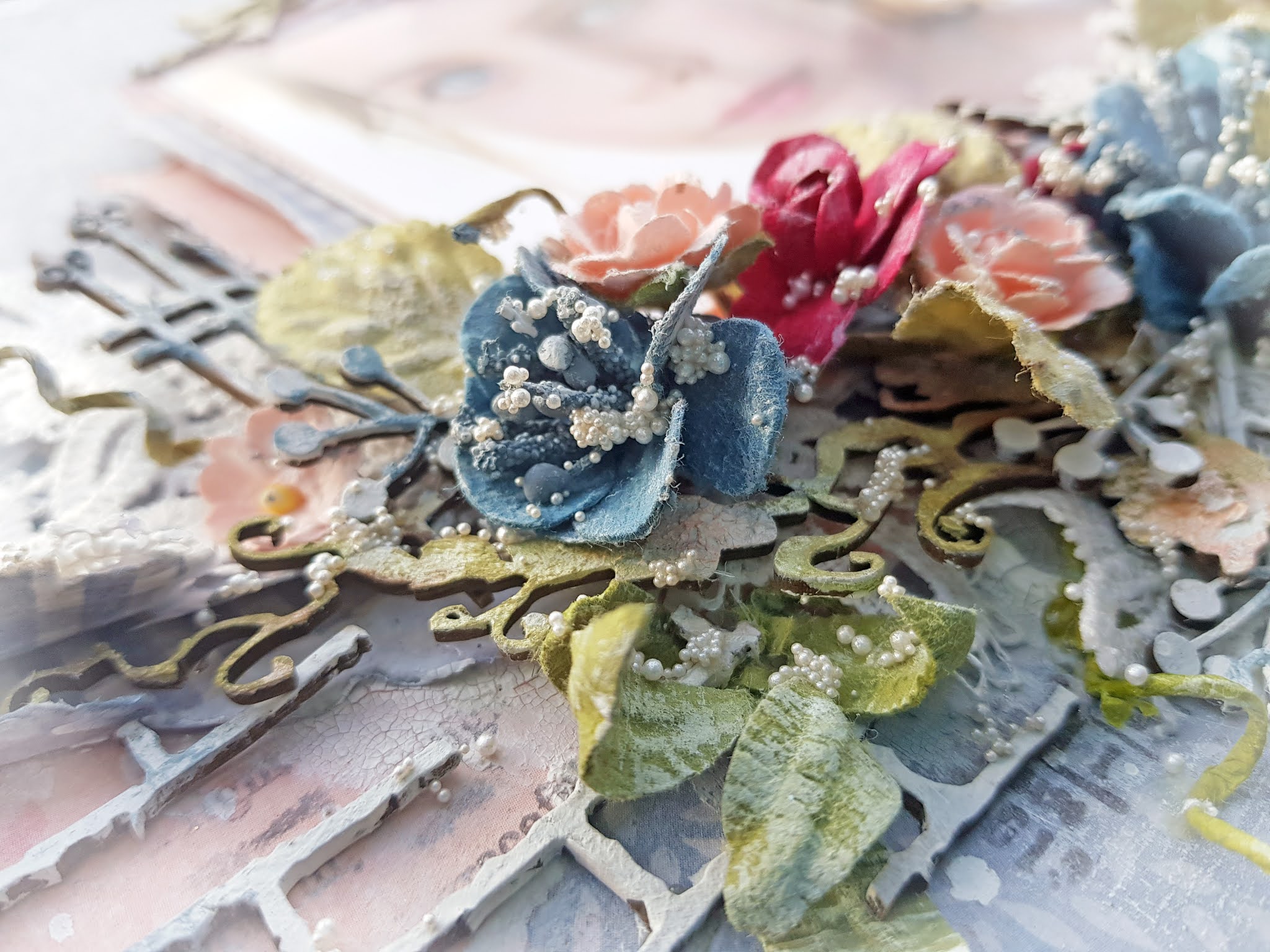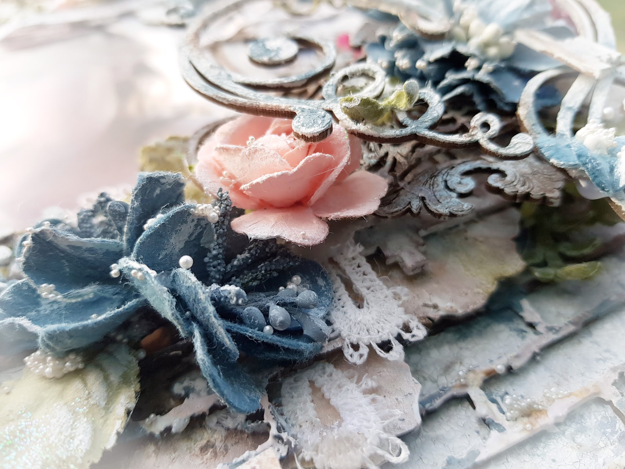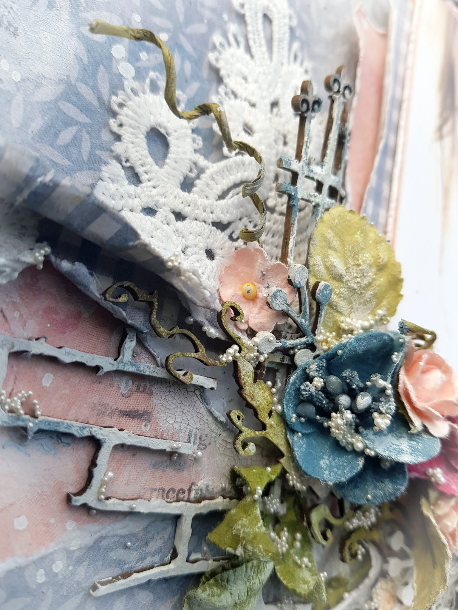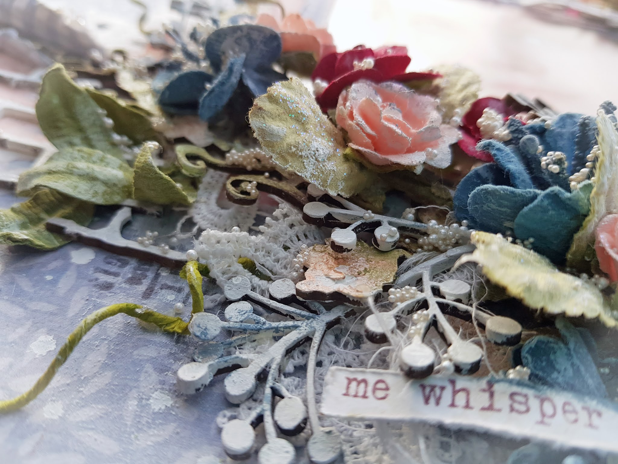 I used a number of gorgeous pieces of Dusty Chipboards some you will probably have to look very hard to see but they are there. For me it is all about the layers. So starting off once all my paper layers were down I added in the new release chipboard the “Flowering Vine”. I have used the smaller vine from this pack. It was dressed in white crackle paste along with Inka Golds in the colours of mint and apricot.