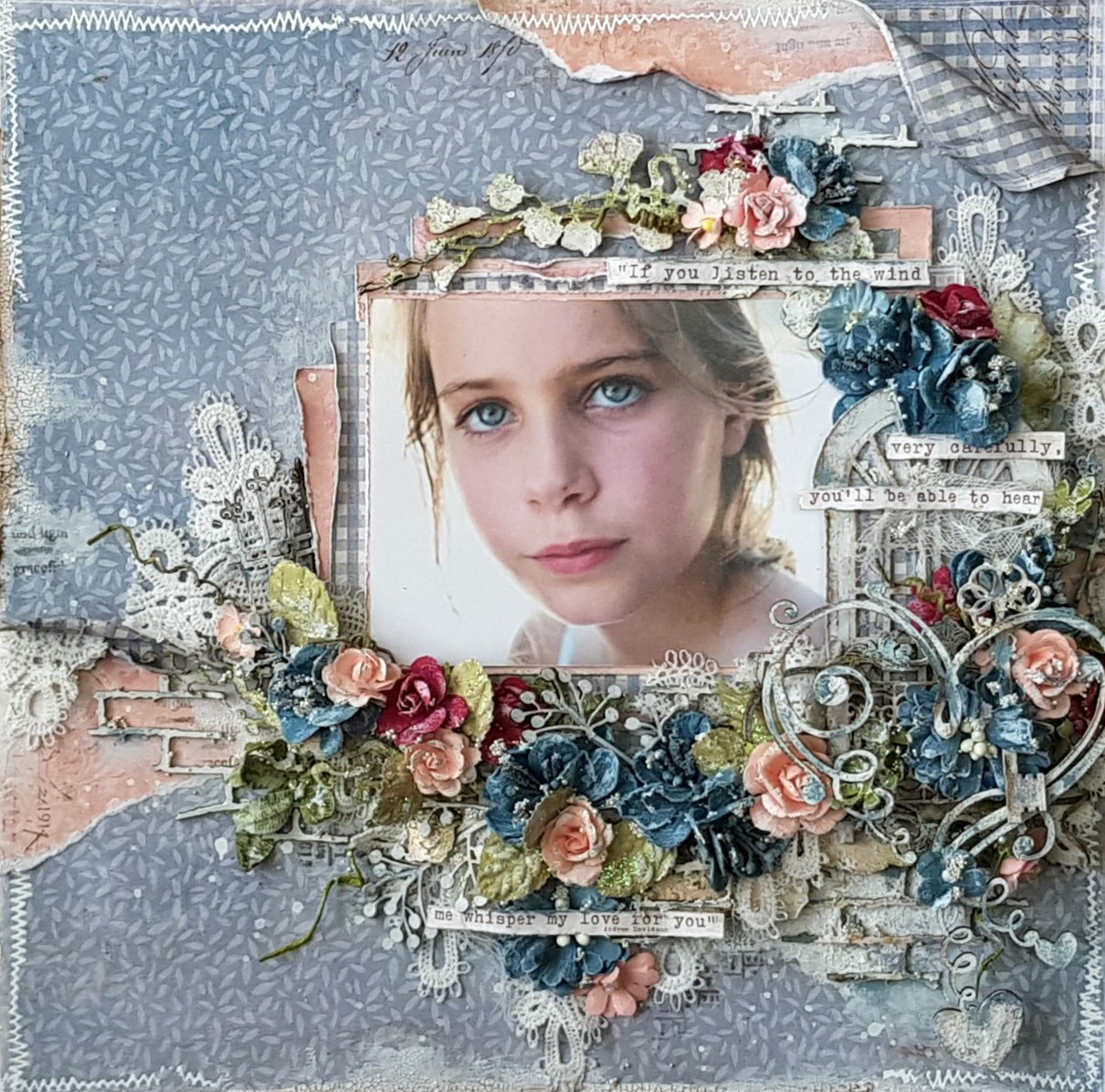 Just beautiful don’t you think? So I found my photo to work with this and went to work. I made lots of layers using torn papers from the Maja collection in the tones of the blues and apricot as in the moodboard below. I couldn’t believe really how close these colours were.