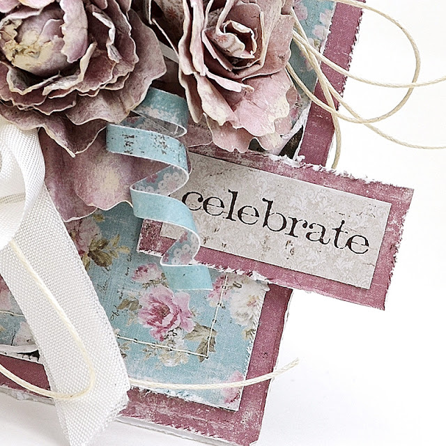 The beautiful papers absolutely work magic in bringing this festive rose garden to life. The roses, stamped sentiment, and curly confetti are handmade from design paper. The only portion of this project that is not made with Maja Design paper is the twine and ribbon.