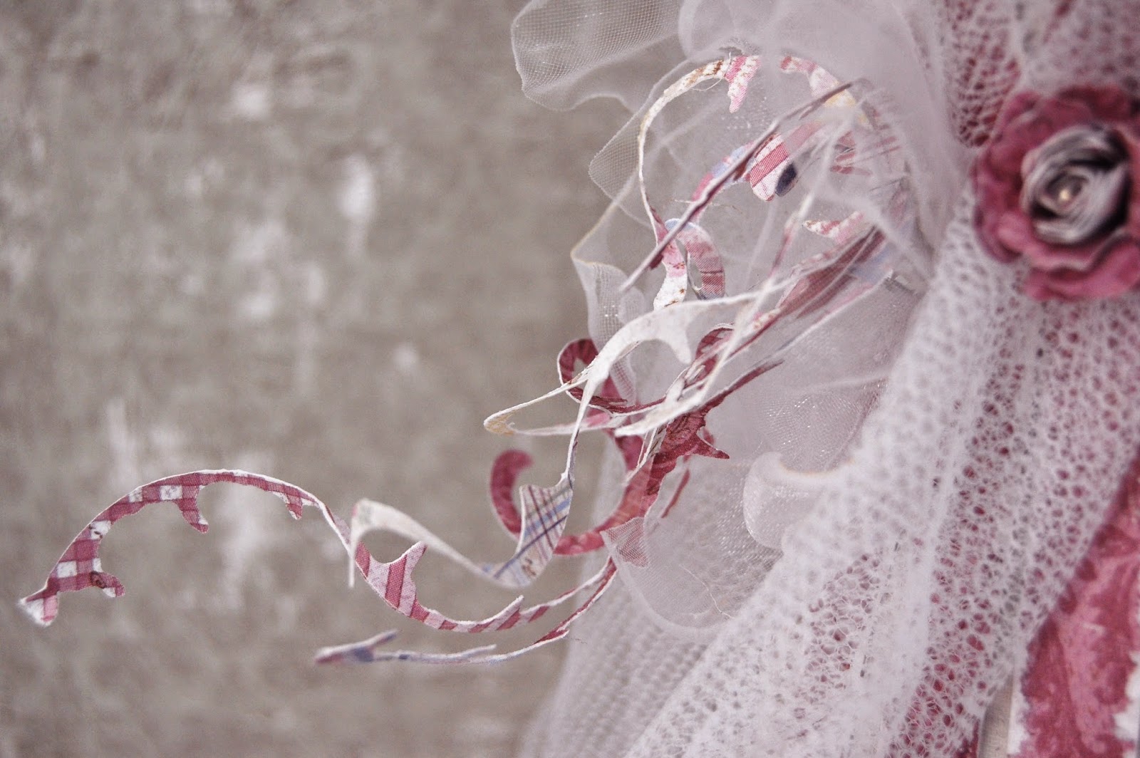 I always use a white background for my project so I was a bit scared to use this colored one but it was the only way to showcase the tulle from the dress. The background are two sheets from the Vintage Summer collection, 1921. The dress form is about 40cm high.
