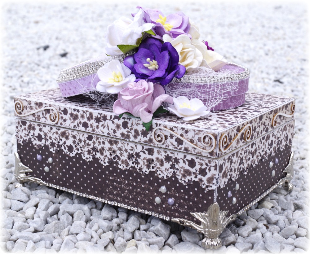 I often create boxes that I use metal feet in silver, and yes it is on this box too. At the bottom edge, I glue on a silver chain, which runs all the way around the box. On the lid I have used wood from Wychinka, these I have embossed with white embossing powder from Ranger. The three half pearls that you find on the side of the box are made with Nuvo Crystal pearls, the colors I have used are Oyster Gray, Ivory Seashell and Wisteria.