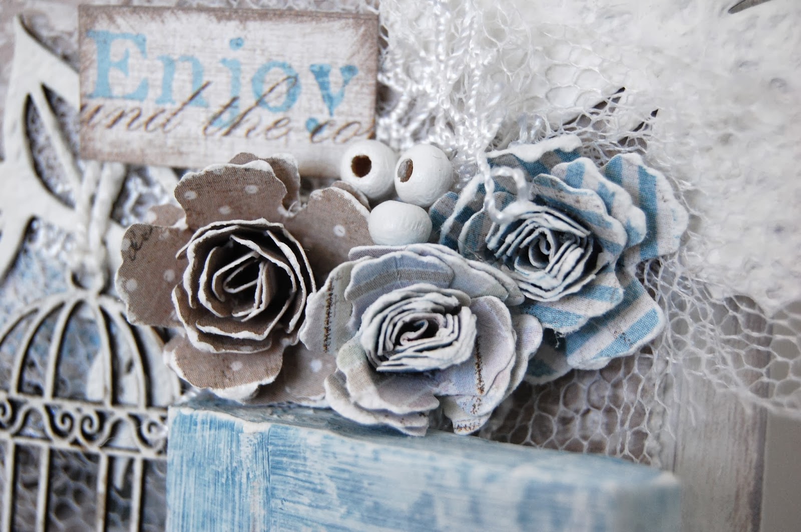 All of the flowers were made with this collection also. Put them in a bed of lace, tulle and small wooden beads. Used the Spellbinders, Shapeabilities die by Donna Salazar to create them. Distressed the outside of the flowers with a distressing tool.