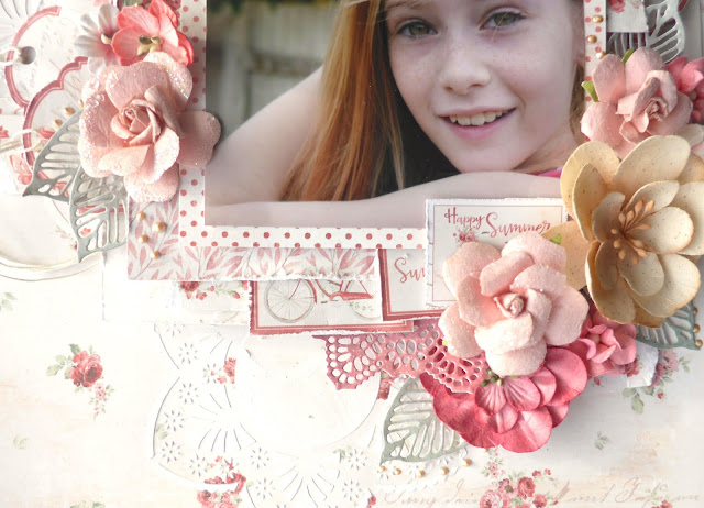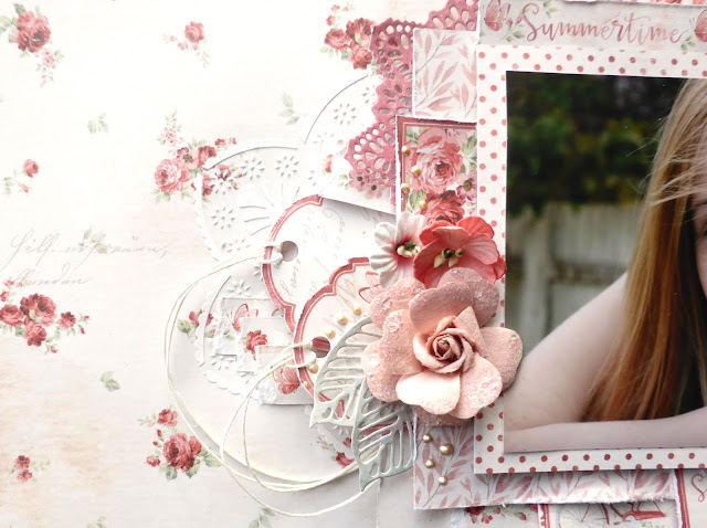 For my scrapbook layout project here today I kept everything very clean indeed. I did a simple stamped border with embossing powders. Again as always I have added in some fussy cut elements from the Summertime (In the Garden) – Smell the roses patterned paper.